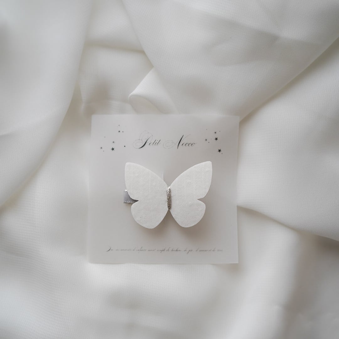 日本のデザイナーさんのハンドメイド商品です フランスやヨーロッパのお洋服とも相性がとても良く、特別感もある素敵なヘアクリップ。 こちらはミニサイズ ビジューがついていないノーマルタイプです 繊細な髪にもなるべくとまるよう、ピンの上下に滑り止めがついています。 基本のお作りとしてはクリップは正面からみて、左開きになっています。ミニサイズは右開きです。 サイズは2枚目お写真を参考にしてください ひらりと蝶がとまっているかのように見えるのがとても可愛いクリップ。お好きな位置に蝶をとまらせていろんなアレンジを楽しんでいただけると嬉しいです