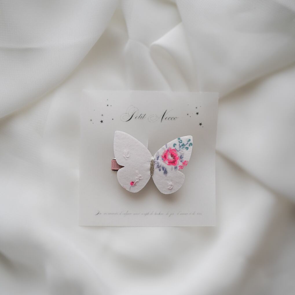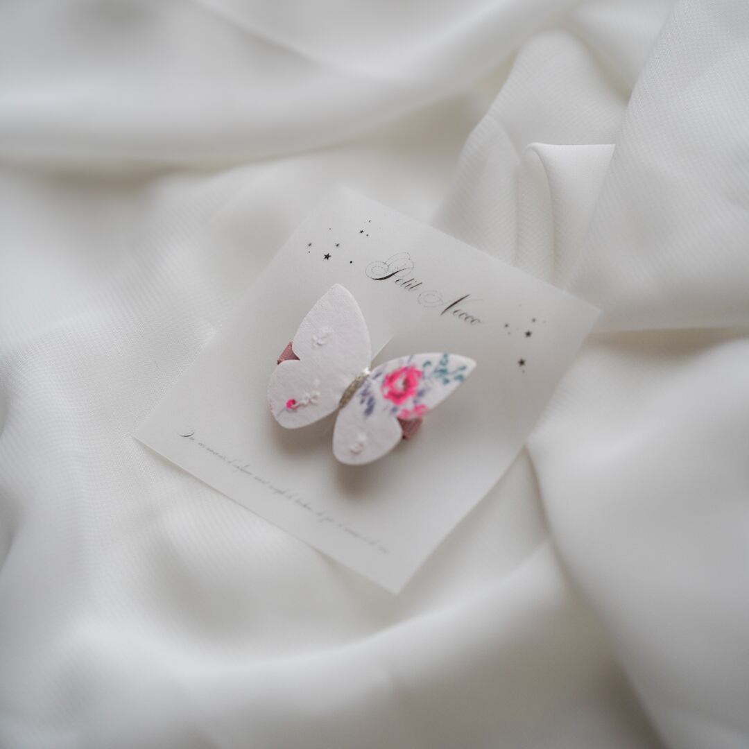 ひらりと蝶がとまっているかのように見えるのがとても可愛いクリップ。お好きな位置に蝶をとまらせていろんなアレンジを楽しんでいただけると嬉しいです
